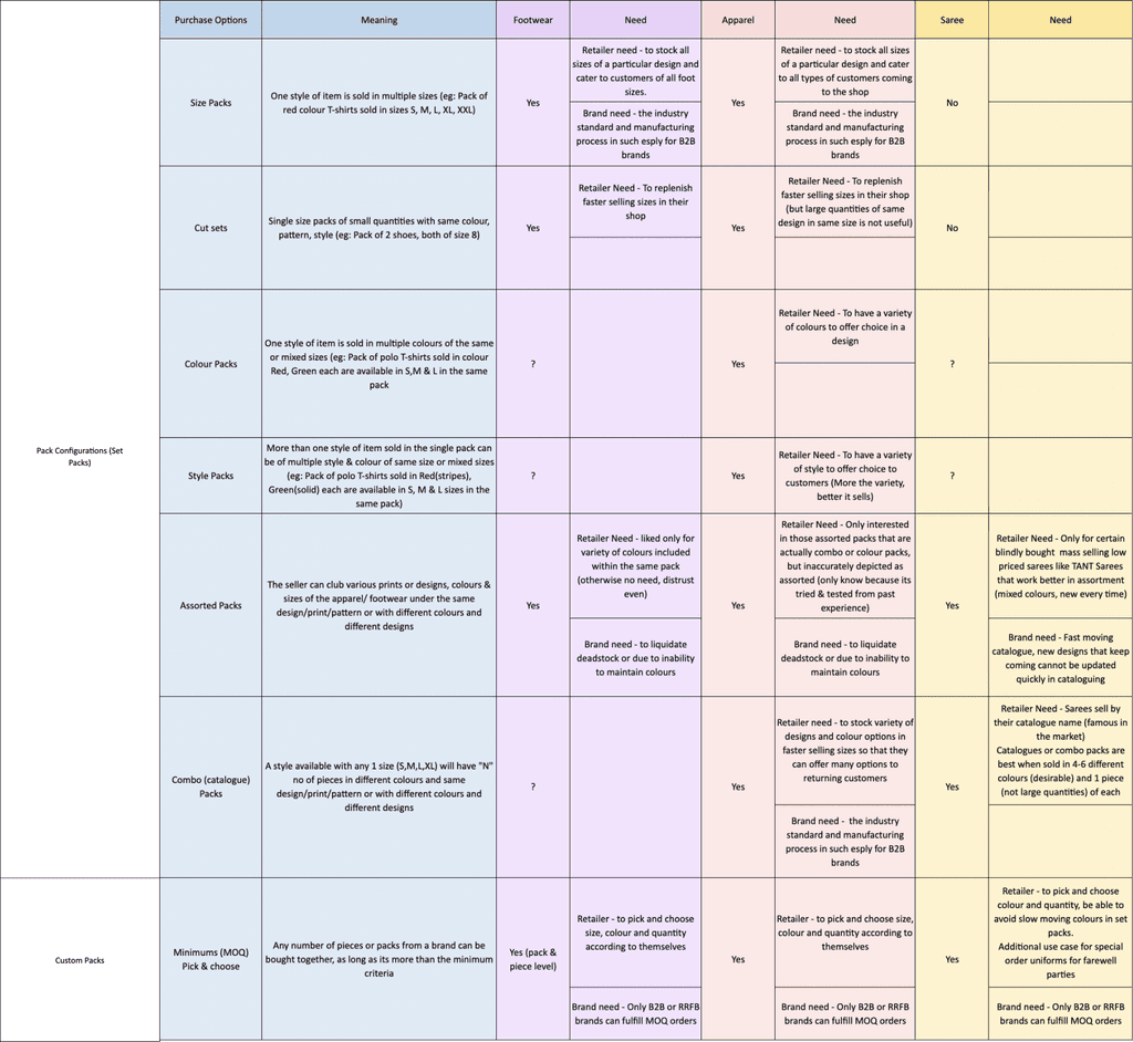 This table represents all the types of packs discovered and their use and need. This framework formed the foundation of our understanding for all the ideation in the next steps, dictating the diversity of needs to be accommodated in the design.