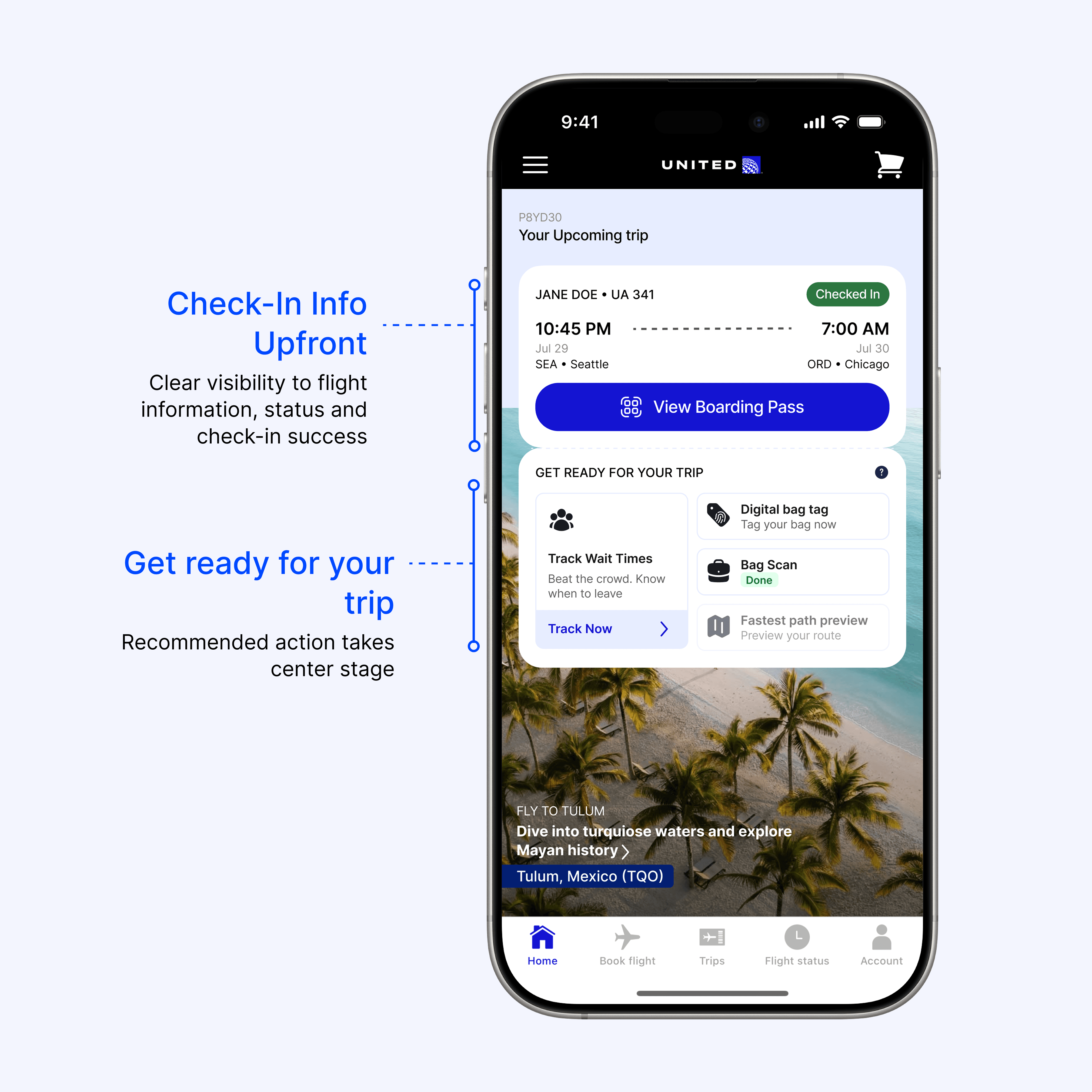 After check-in, boarding pass + flight details stay upfront