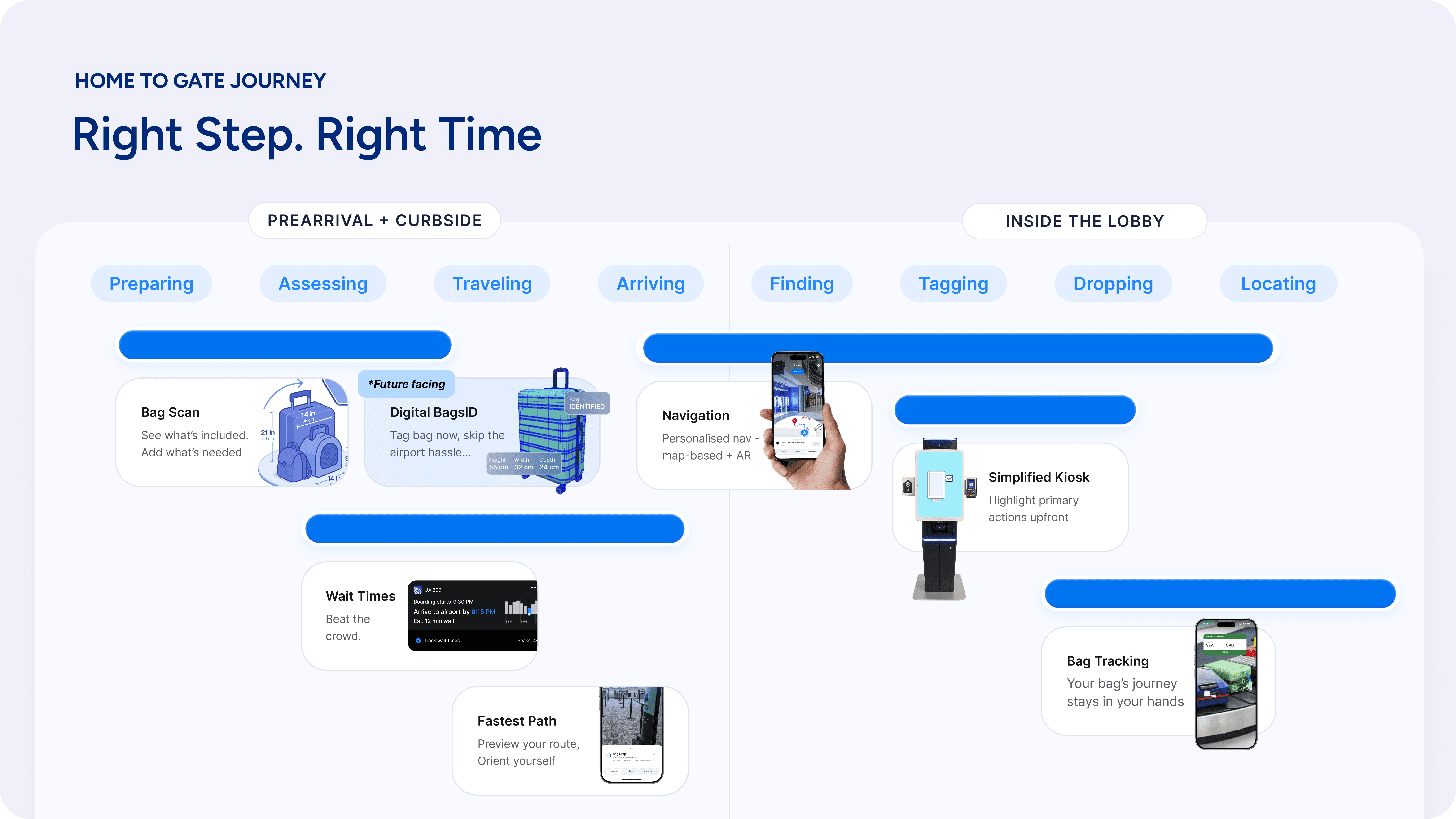 Breaks the day into clear steps: kiosk → bag drop → TSA → gate