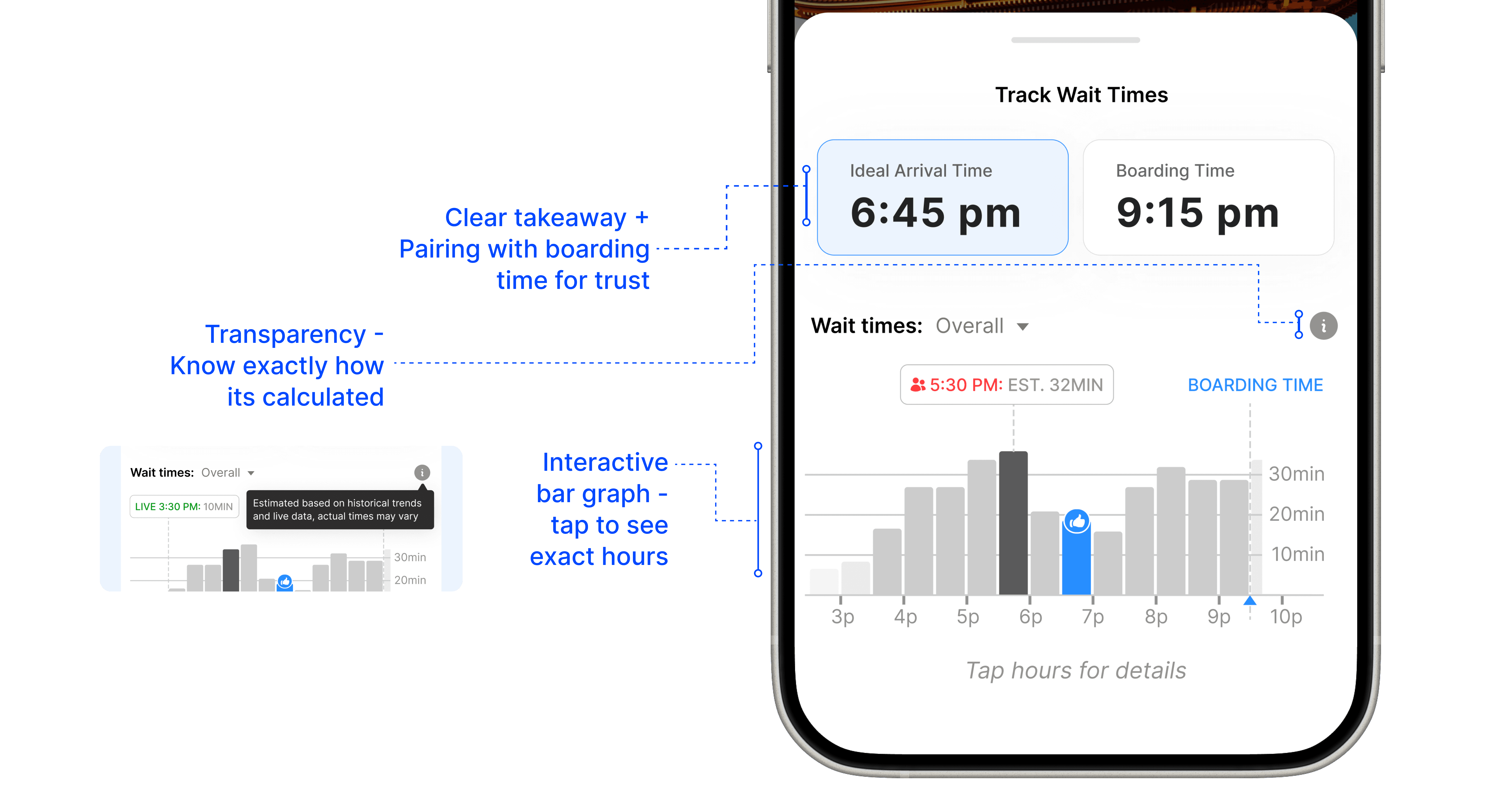 6 hrs before boarding, travelers see live + predictive wait time